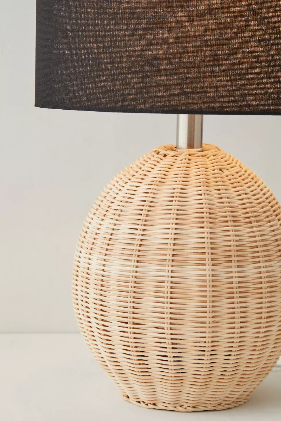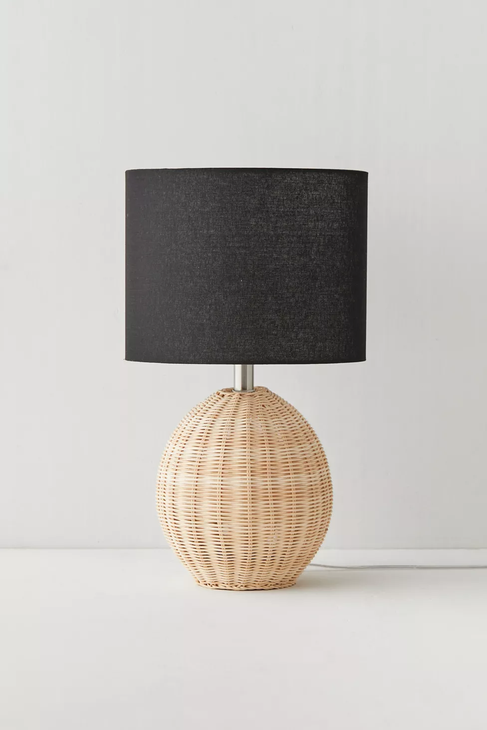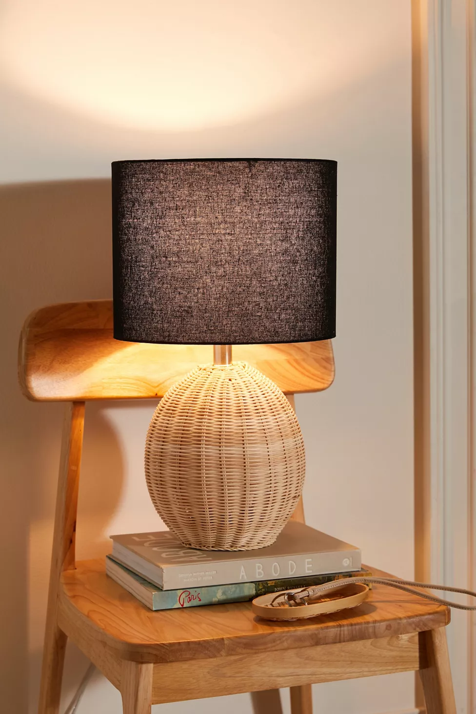 Lampe de table en osier avec abat-jour noir, idéale pour un éclairage cosy dans coin lecture ou chambre.
