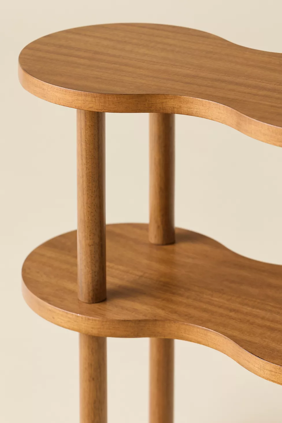 Table d’appoint en bois au design ondulé, avec étagère inférieure, parfaite pour exposer plantes, livres ou objets décoratifs dans salon ou chambre.